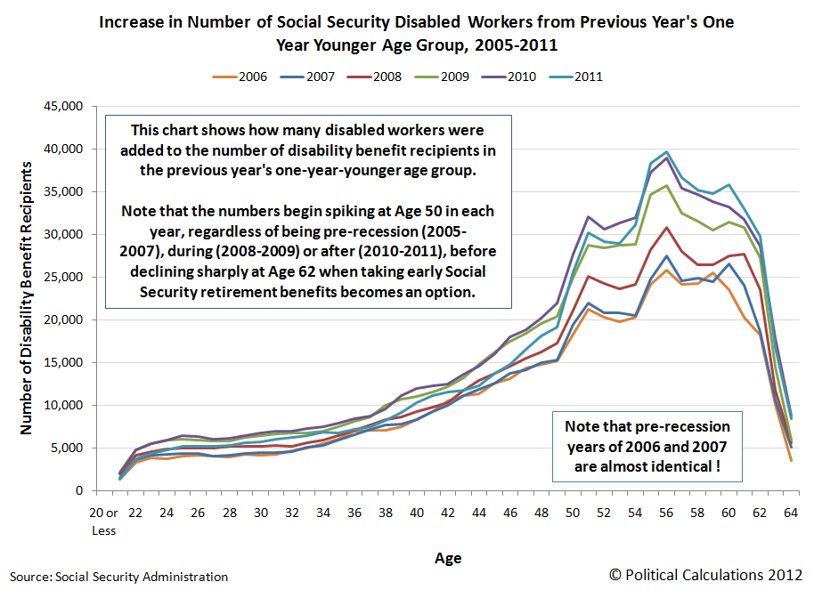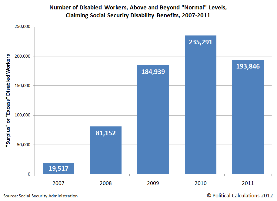 The chart above, showing the number of “surplus” or “excess” Social Security disability beneficiaries added in each year since 2007, indicates that the recession is the driving factor behind the increased number of individuals obtaining government disability payments, as the timing of the surge coincides with the expiration of government unemployment insurance benefits for individuals who were negatively impacted by the economic contraction, which officially ran from December 2007 through June 2009. The nation’s sluggish economic recovery accounts for the decline in the number of surplus or excess Social Security disability program beneficiaries measured in 2011.