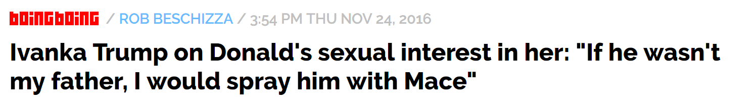 Never saw much reporting on Ivanka’s response to Trump saying he wanted to date her: “If he wasn’t my father, I would spray him with Mace.” pic.twitter.com/RVlP4DdIc1