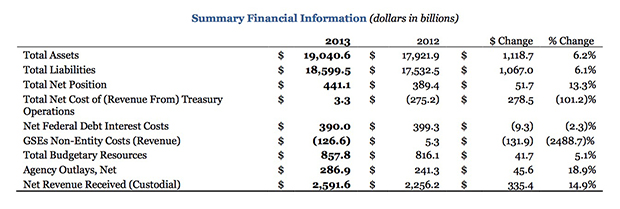 The $126.6 billion that Treasury received from the Fannie and Freddie NWS is also noted in the “Consolidated Statements of Net Cost for the Fiscal Years Ended Sept. 30, 2013 and 2012” that the report publishes on page 50.