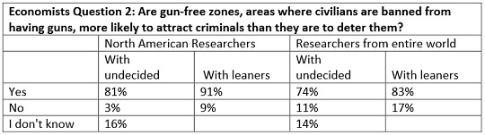 You can browse through the study results at the link for yourself. (It’s not terribly long.) As a bonus, to compare American attitudes to those in less freedom oriented nations, they included professionals from other countries as well. But one of the first, top line questions really sums up their findings nicely. They asked the question, Are gun free zones, areas where civilians are banned from having guns, more likely to attract criminals than than they are to deter them?